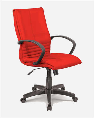 Office chair with handles, backrest by mesh fabric, surface made by foam covered by mesh fabric, can adjust (low, high) by rod. The leg by plastic, having wheels